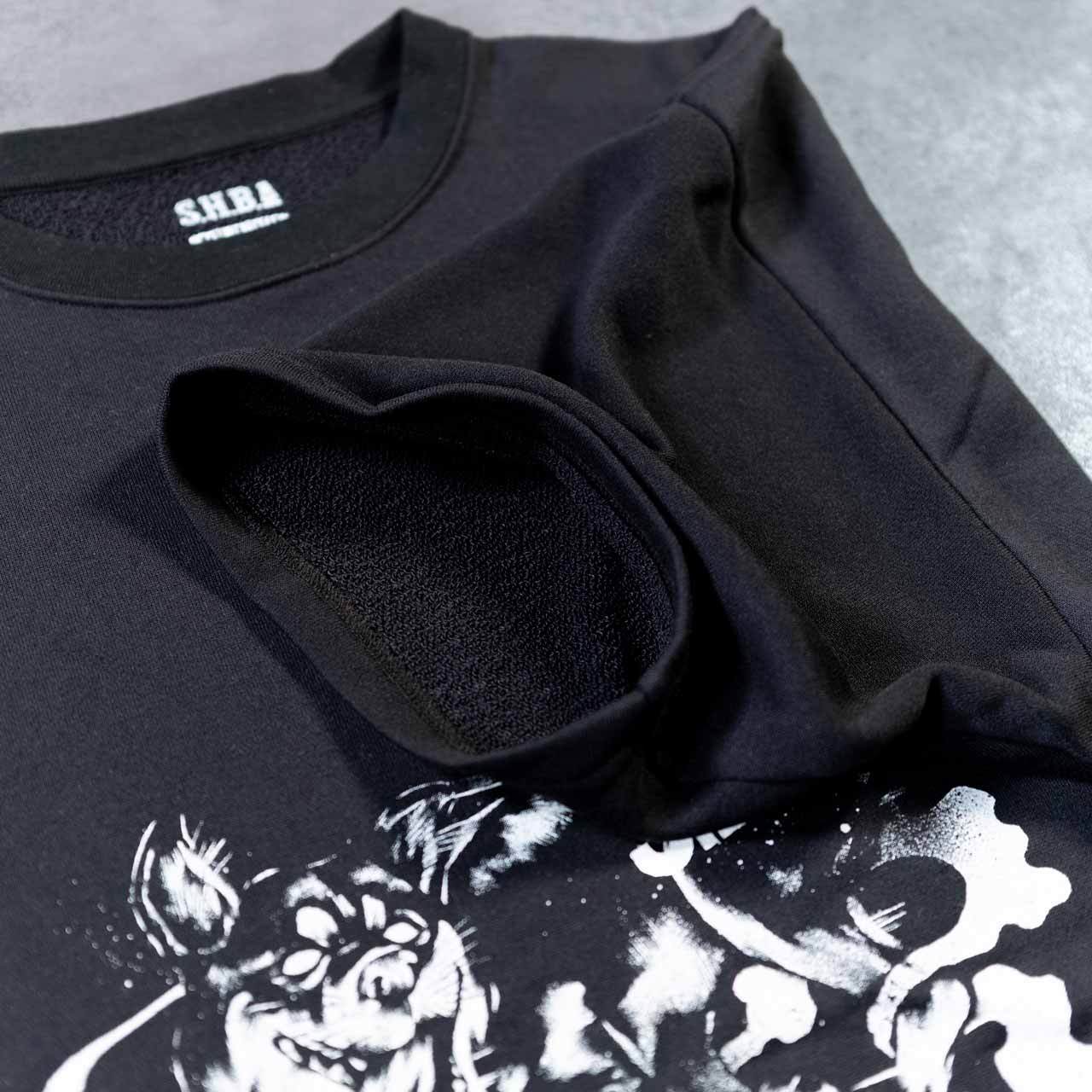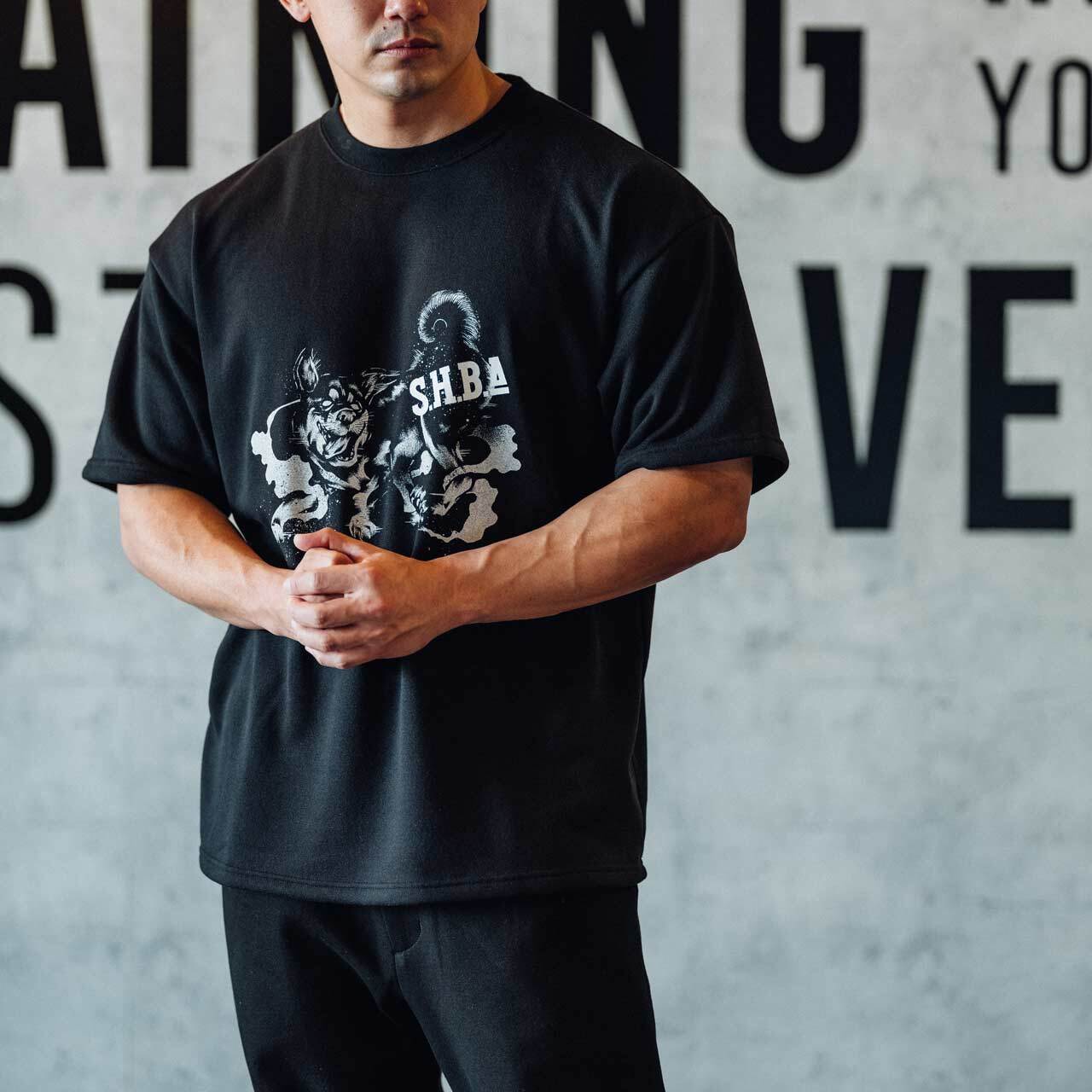 トレーニーの体型にフィットするように理想的なシルエットを追求した、ワイドシルエットのTシャツです。S.H.B.A.ブランドを象徴する孤高の黒柴のアートワークを大胆にデザインしました。