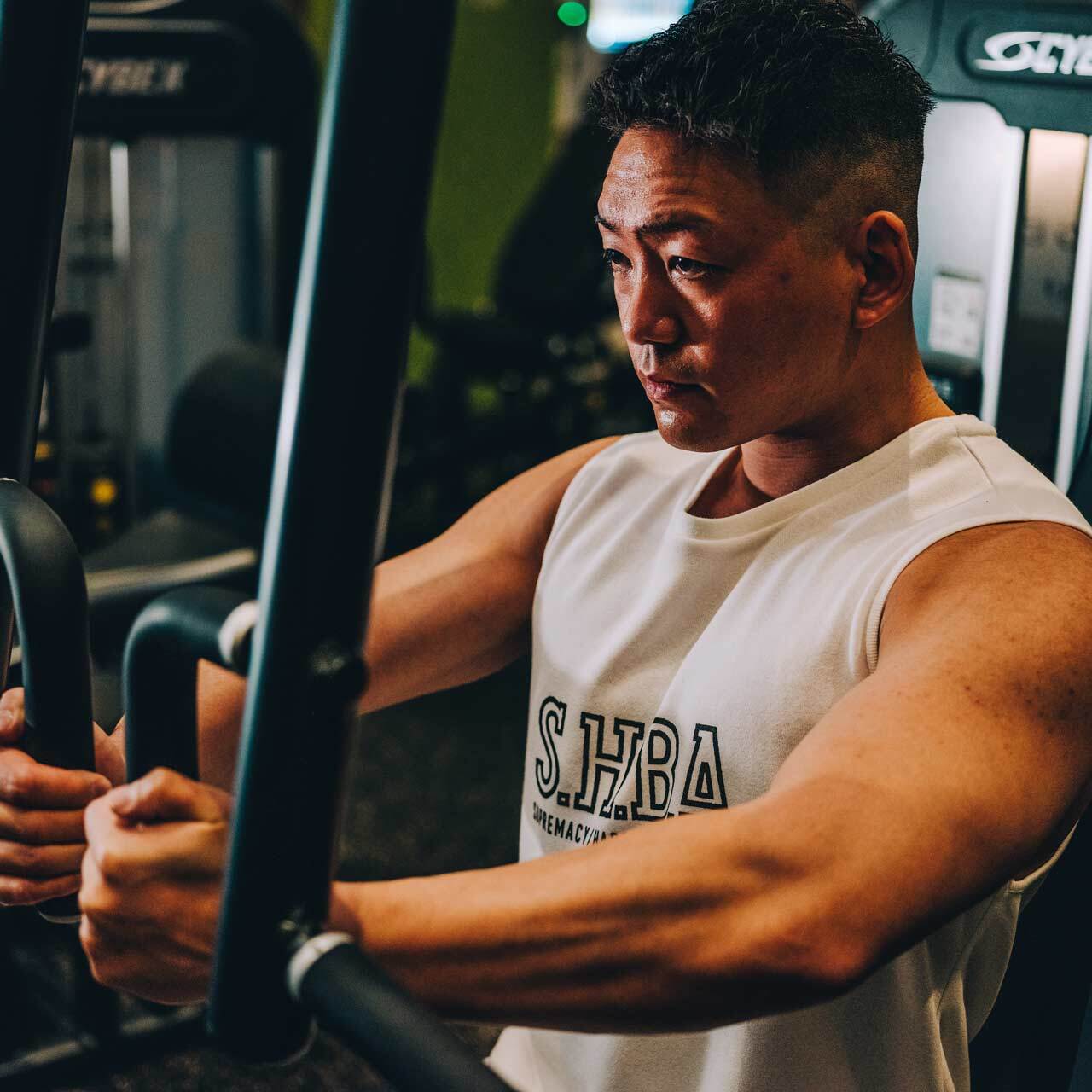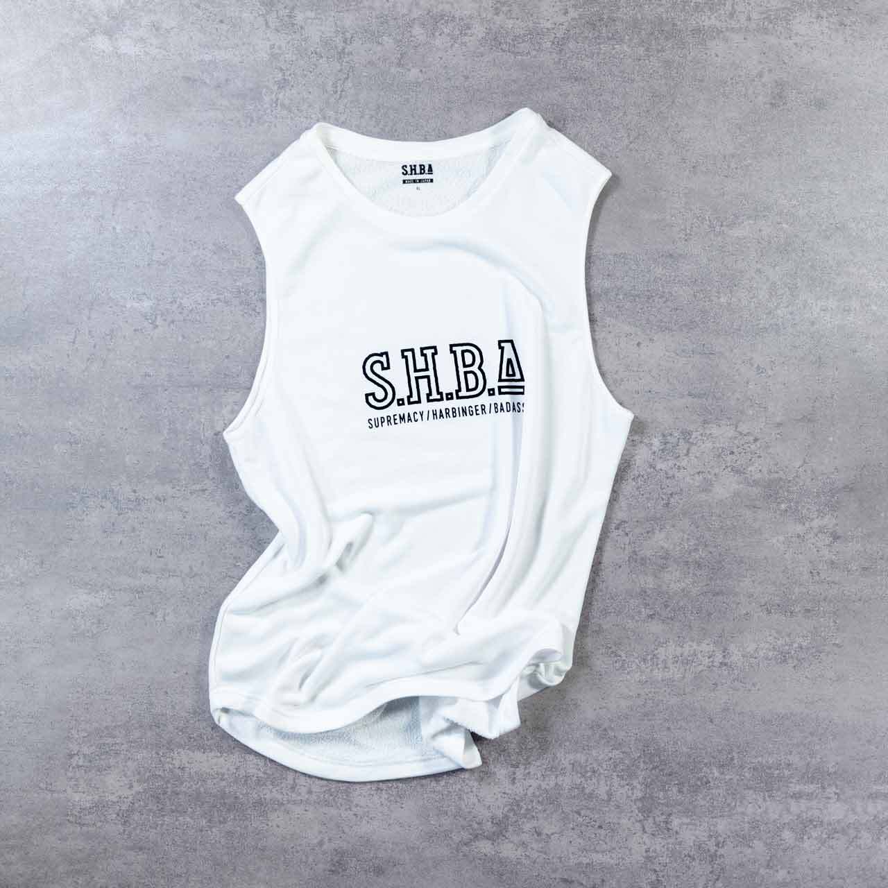 トレーニーの体型にフィットするように理想的なシルエットを追求した、ノースリーブシャツです。S.H.B.A.ブランドのアウトラインロゴをフロントに大きくデザイン。